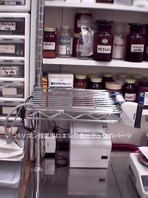 設置全景スチールラックにバーコードスキャナとノートPCを固定設置した全体の様子。 下の写真は、急病診療所薬局でのパソコン&プリンターの設置例です。 当初は左側の薬品棚の中に、PC&プリンターを設置していましたが、医薬品の増加で追い出されて、こんな形になりました。ノートPCの音量が小さいのでアンプ付き外部スピーカを増設しています。 ラック用パイプは床面から立ち上げ、手すりパイプの固定金具2ケで薬品棚に固定しています。 写真のようにマウス用ラック2段重ねの豪華版?です。 ACアダプター類は、薬品棚の外側面にぶら下げてあります。 急病診療所薬局にApo散剤監査システムを導入するために掛かった費用は、 新品の電子天秤(新光電子 オプションつき DJS−300 7万円) 中古のノートPC (WindowsバックアップCD付き +IBMViaVoice 約3.5万円) ・バーコードリーダ・レシートプリンターのフルセットで約16万円程度でした。 後にスチールラックを6千円程度で追加購入。 Q&A掲示板の書き込みでは、手持ちの機材を流用して、3-5万円で「おしゃべり天秤」を作り上げた先生方も多くおられます。 |