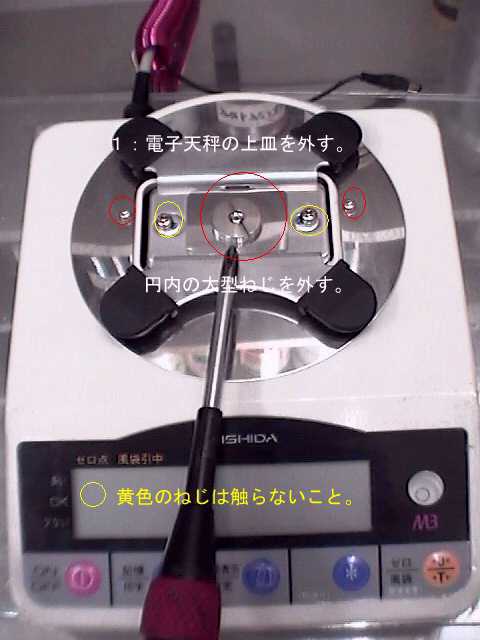 電子天秤へのオプション取り付け電子天秤を新規購入する場合は、オプション付きで発注すると、メーカの方で組み込んでくれます。当店の場合・(株)イシダ(新光電子製造)のMB−A600という認定印付き電子天秤を計量法改正時(2000年)に新規購入した。・この電子天秤のオプションとしてRS232Cユニットがあったので、今回はRS232Cユニットだけを追加購入した。 ・他社製電子天秤への対応:イシダ・大和ハカリ・ウエダ・高園などの販売業者の扱っている物は、新光電子(株)製造のOEM品ですから、そのまま使用できます。(音叉振動式のもの) ・新光電子CGHシリーズは、データフォーマットが一部異なり、g数読み上げが棒読みになってしまいます。DX版は対策済みです。 ・ユヤマ・島津・A&Dなどの電子天秤については、RS232Cフォーマット及び通信設定の情報がないので、未対応です。 分解・上皿を外すと、5個のネジが見えます。写真赤丸の大きなねじと、最も外側の2本のねじを外します。・黄色のねじを弄ってしまうと、メーカにて再調整が必要になるとの事であるから、注意。 |