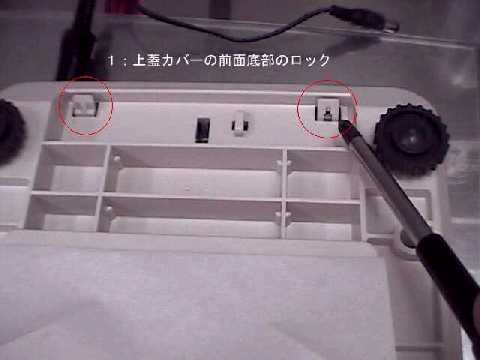 開腹手順左写真のように前面底部のロック爪を外す。 後は、上カバーを持ち上げると、後ろ側のロック爪は簡単に外れる。 |