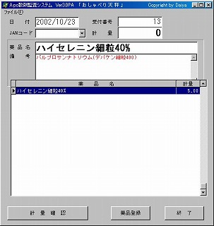 監査・レポートの活用(A5用紙のフォームも基本的に同じです。用紙サイズのみ変更。)・1行目に受付日付(PCのデータ)・受付番号(散剤の受付番号であり、全処方箋の受付番号ではない。) ・3行目からは計量1回毎の銘柄名と計量g数が履歴として印字される。 どこで何をどれだけ計ったかが良く判ります。 ・Total行以下に銘柄別の計量g数合計が印字されているので、 1:処方箋の記載銘柄が正しく選択されているか?チェックします。 2:銘柄毎に処方箋の記載g数*日数を再計算してレポートの計量g数と突き合わせチェックします。 3:分包回数のチェックは、実際に分包数を数えてチェックします。 1:で銘柄の読み違いや取り違い、2:で主薬量・力価からの換算ミスをチェックできます。これらのチェックを行える事が散剤監査システムを使う最大の理由である。 ・最下行に、計量した総g数が印字される。 ・調剤・監査薬剤師欄を設け、印を押すことで責任の所在を残すことができる。 ・Ver3.0ではフォントを大きくして目にやさしくなりました。 ・また、PCその物の操作に不慣れな薬剤師も多いので、通常業務は「PCに触れるのは起動時に電源スイッチを入れる1回だけ」で済むように、業務終了時も”1111111111116”というバーコードを読ませるだけでApo散剤監査システム・プロトーカー97はもとより、Windowsまで一気にシャットダウンできる様にした。 Windows95・98・98SEで動作確認済み。WindowsXP・NT・2000では、権限取得の関係でwindowsのシャットダウンまでは出来ない。 その後の情報でテキスト読み上げソフトもフリーソフトが2本公開されていることが判明。詳しくは下記URLをご参照下さい。 http://interhills.power.ne.jp/muratagumi/reporter/ http://www.forest.impress.co.jp/article/2000/07/10/yomiagetool.html |